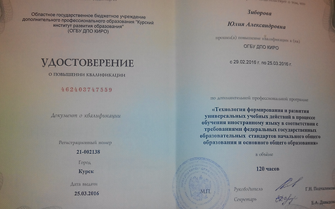 Закончила "Обоянский педагогический колледж" по специальности учитель иностранного языка в 2009г. В 2012г. закончила "Курский государственный университет" по специальности педагог-психолог. В настоящее время прошла курсы переподготовки в КГУ по английскому языку.